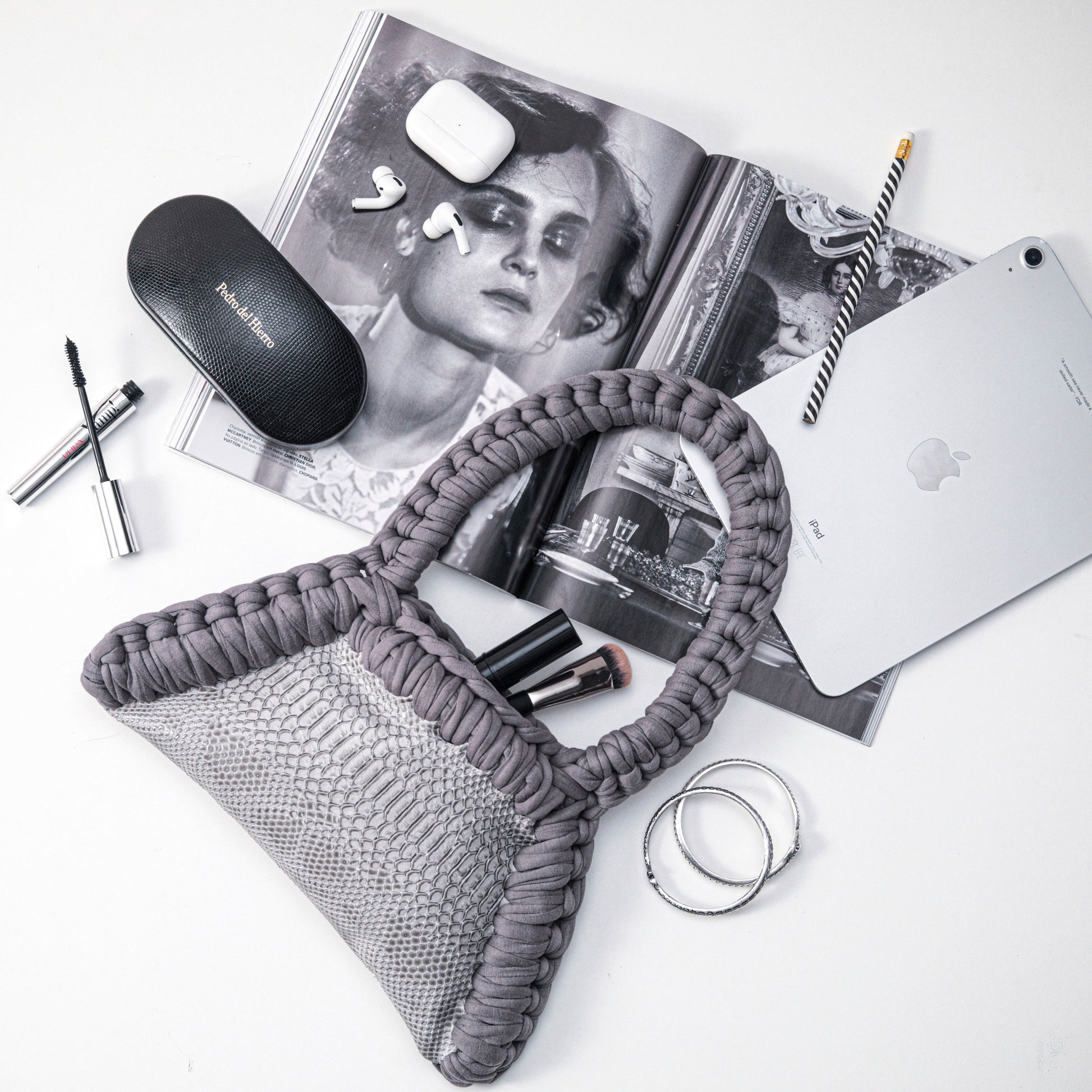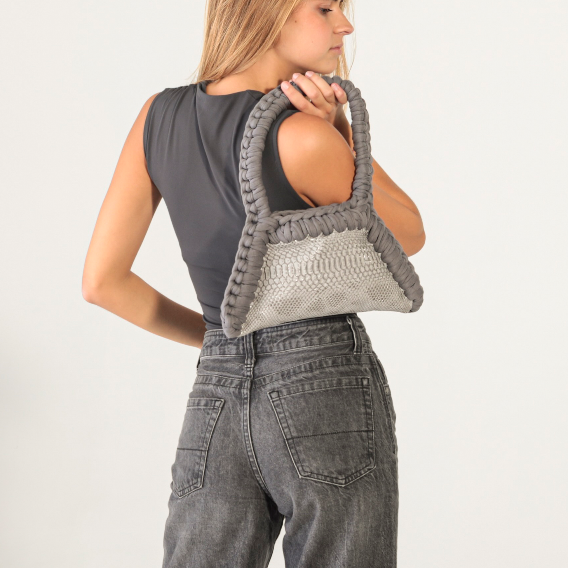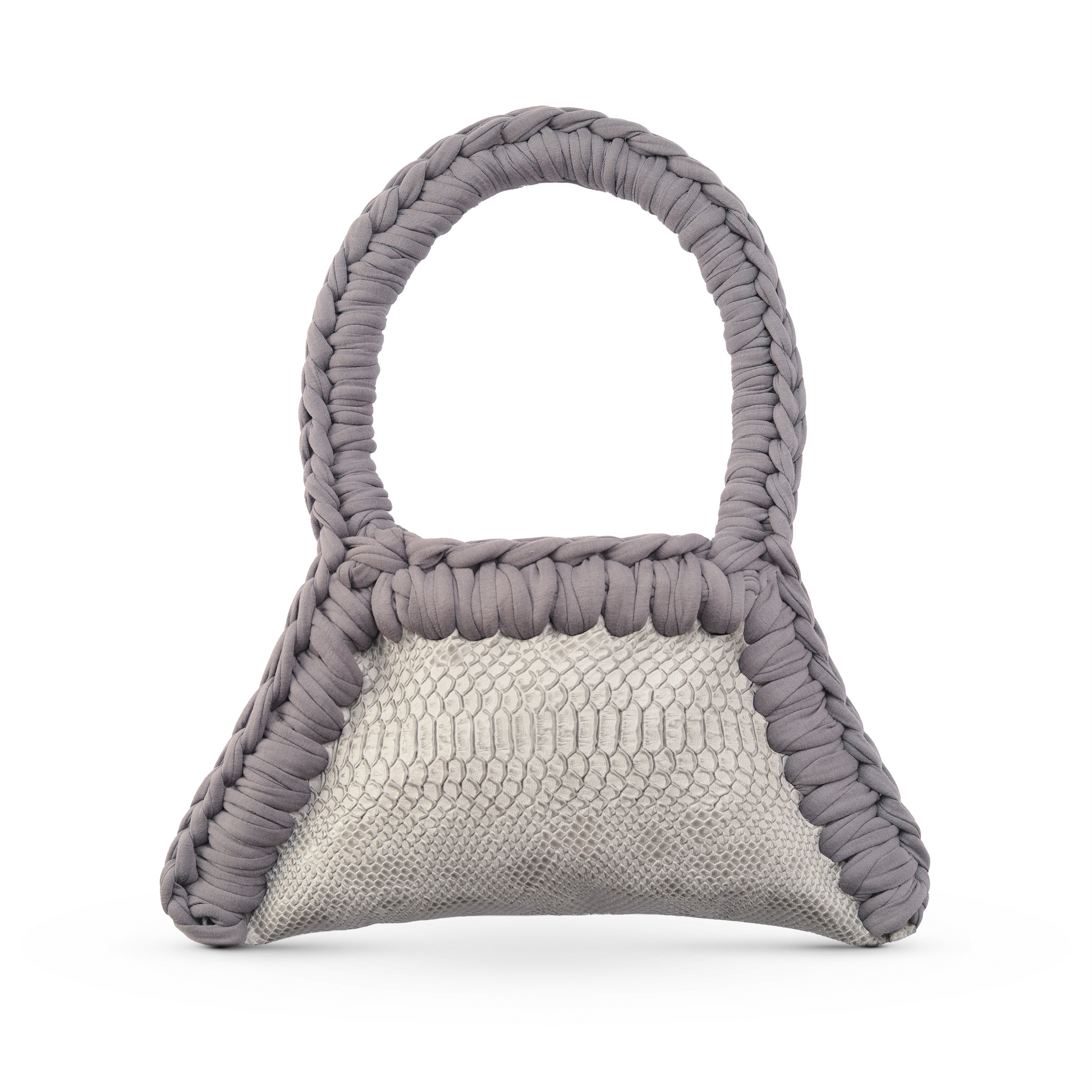 A Street Madly é uma mala feita à mão em napa cinzenta com textura escamada e acabamento em croché no mesmo tom.